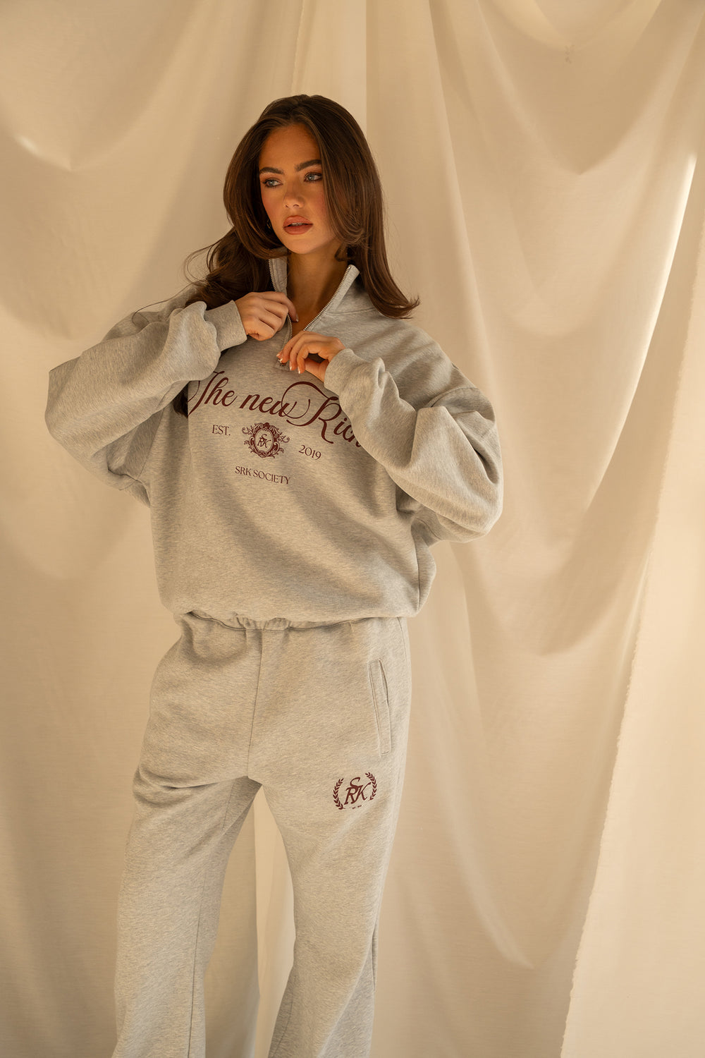 'The New Rich' Quarter Zip sweater 'Grey Melange & Burgundy'